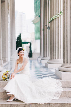 Inspired by our passion of food and restaurants in the city, we named our guest tables after the 35 most significant restaurants to us, and our escort cards were actual business cards of those restaurants. Inspired by our enjoyment in Broadway shows, we designed the program after a PlayBill which included a piece of our story at each of the 35 restaurants. We also put up a few statement sized engagement pictures framed like Broadway show posters at the entrance of the foyer. There was an open snack bar serving 7 (the number of years we dated) of our favorite snacks from the US (thanks for our bridal party flying in the snacks): wasabi almond and lemongrass cashews by Trader Joe, Hershey’s chocolate covered pretzels, salty popcorn, M&Ms with our picture and logo, fortune cookies with a thank you message and lyrics of the song from our first dance “When You Say Nothing At All”, a tree of decorated homemade cookies. There were street signs after those in NYC pointing to a few landmarks of the city: Broadway – the ballroom, Central Park – the cocktail area where we brought in replicates of the bench and lamp post used in actual Central Park, Columbus Circle (of course), and added a hint of personal touch by including a sign pointing to the bathroom. Also, since we both like golfing, we had corsages made with a souvenir golf tee we got from some courses we played on, and paired it with our theme flowers, billy balls, which are in golf balls shape, while serving one of our theme colors: yellow.