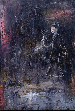 Nina Kuo “Han Dynasty Figure, Hair Dryer”, 26″x18″, acrylic/wood, 2000.