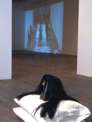 Not all of Min’s works are as somber. In her joint project Will ****For Peace (2002) with Allan deSouza at Oboro Gallery in Montreal, the couple slept in a bed in the gallery, recreating Yoko Ono and John Lennon’s famous Bed-In. Inside the gallery hung word bubbles where participants were asked to fill out the space between the words “Will **** for Peace.” Min also asked participants to cut strands of her hair, as she would later say, for “souvenirs.”