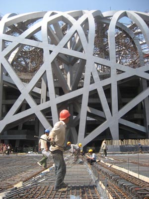 Approximately 5,300 migrant workers make up the force behind Beijing’s Olympic construction. Many hail from Henan, China’s most populous province. My quick survey of hometowns produced enthusiastic echoes of “Henan! Henan!” throughout the bird’s nest.