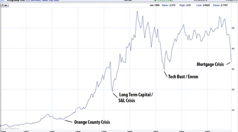 In 1998, the collapse of Long Term Capital led to the savings and loan crisis. Citigroup fell from $36.10 in July 1998 to a low of $14.25 in August of 1998 – a 61% drop in two months. It wasn’t until April 1999 that the stock recovered and hit its next peak of $38.13.