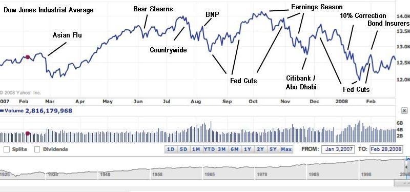 You’ll notice that it’s basically been a roller coaster over the last year. Problems arise. At first, the market believes that the problems are contained. When it’s apparent that they’re not, government and institutions step in and try to solve the problem. As in all credit crunches, these entities are battling fear, the fear that any investment carries the risk of being associated with bad debt in some form. When the Fed cuts, or an investor steps in to buy shares in a troubled company, these actions cause the market to rally. And then the next problem arises and sends the market down again. And so on…