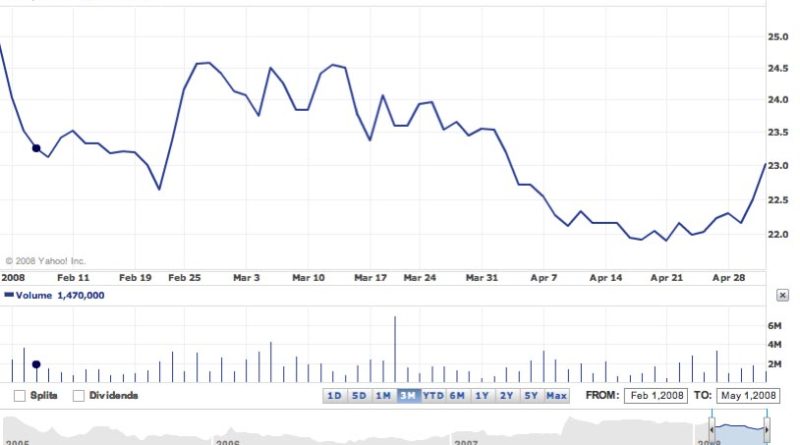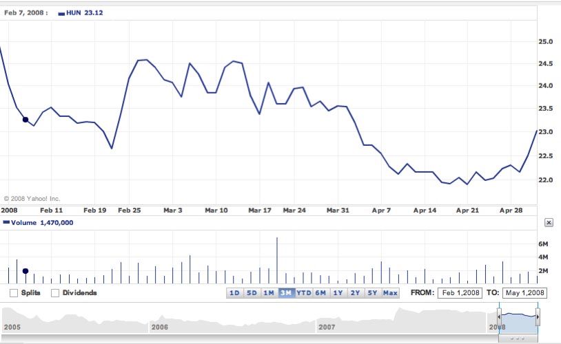 In previous announcements, Huntsman has said that a transaction will not occur before May 3rd, and the company is scheduled to report earnings on Friday, May 9th. Sometime in the next two weeks, Huntsman will have to give some indication of the transactions’ status. If the indication is positive, meaning that the deal is on track and is likely to close soon, then the stock price will hold or rise. If there are extensions or additional problems, the stock is likely to fall. An extension will cause some investors to step out and perhaps come back at a later date. If the problems are more serious, the stock is likely to fall to pre-transaction levels ($17-20), or somewhat lower because the economy is now weaker.