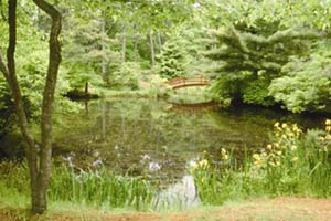 The original acreage was a gift, with endowment, of Mrs. Seth Wakeman in 1976. Additional land given was given in 1981. The garden's signature feature is a small pond with an island that is reached by walking over an arched bridge. Winding footpaths take visitors through a birch walk, camellia dell, stone garden, and hillside garden. A rustic shelter offers broad views of the garden and a chance to become immersed in the meditative qualities of the landscape.