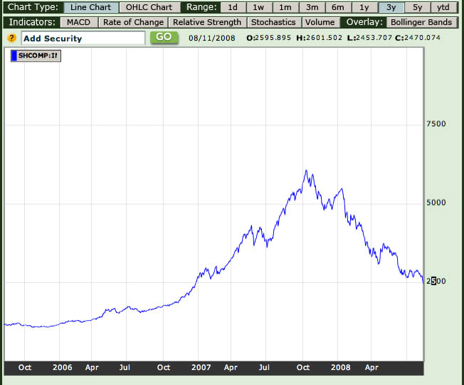 As in all things, timing can be critical. And right now, the market seems to be worried about China. Economic growth is slowing, from a torrid pace of 11.4% in 2007 to an estimated 8.7% this year, and a projected 8% in 2009, according to Lehman China economist Mingchun Sun. Export growth, which had reached 26% in the first half of 2007, slowed to 21% in the first half of 2008, and is projected to slow to 10-15% in the second half of 2008. Inflation is officially 7%, but the real rate is probably higher than that. Real investment is declining, and controls on bank lending designed to stifle inflation will tighten funds available for corporate China. All these concerns have been reflected in the market, as the Shanghai Composite Index has fallen more than 60%, from a high of 6,092.06 in October 2007, to 2,470 today (chart courtesy of Bloomberg.com).