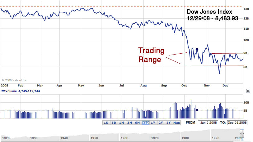 You can already see this pattern of behavior in the markets. Take a look at the following chart of the Dow. Last month, I mentioned that we were stuck within a trading range. We’re pretty much still in that range, now roughly between Dow 9,000 and 8,200. This would be the “base” that is being built: