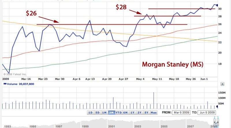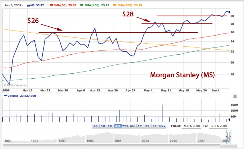 Two other facts are helpful when considering an entry point for Morgan Stanley. The firm recently raised $2.2 billion by offering stock at $27.44 on June 2, 2009. Before that, Morgan Stanley raised $3.5 billion at $24 per share on May 8, 2009. The thing is, we, the retail investors, don’t have access to the stock at those prices. We actually buy in the secondary market, and at the time of those offerings, Morgan Stanley only dipped to $29.89 and $27.14 (closing prices), respectively.