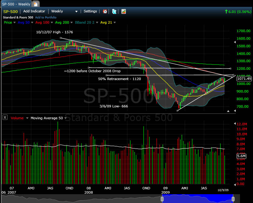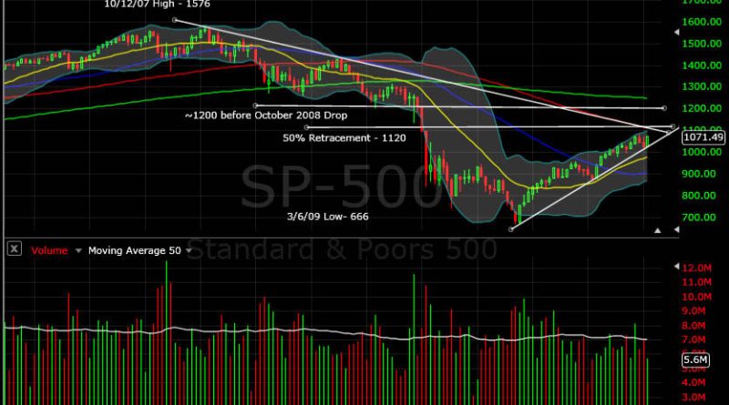Technicians also like to look at upward resistance – levels that are hard to get past when a stock or index is moving upwards. Today, technicians are looking at two major resistance levels – 1120 and 1200 or so, on the S&P. The 1120 represents a 50% retracement from the high of October 2007 to the low of March 2009 (take the high, subtract the low, divide by two and add back to the low). Now many people wonder about some of these technical levels – why should a 50% retracement be important? Truth is, some of this might very well be self-fulfiling prophecy: it matters because people say it does. There are so many people focused on this number right now that almost certainly, there will be resistance when we get there.