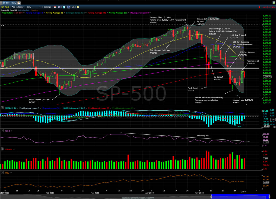 So much has happened in the markets in the month of May that it’s hard to know where to begin. At the beginning of the month, I called for a correction. And we got one, albeit more severe than I expected. The catalyzing event was S&P’s downgrade of Greece to BB+, or junk, on April 27. Soon after, on May 6, we got the flash crash, when at one point during the day S&P was down as much as 100 points and the Dow had fallen almost 1,000 points. We recovered a bit as Europe rushed to put together a bailout package, but it was not long before we resumed the downward collapse. By the time it was all over, the markets had fallen as much as 12% from the April high. Stock market commentators tried to make sense of things, but the range of opinion is so wide it’s hard to know who to listen to. In one camp, the bulls were saying that a 10-15% correction, after the huge run in 2009, was to be expected. Some even put the correction in the 15-20% range. On the other hand, the bears were saying, it’s only going to get worse. As May closed, the press delighted in pointing out that May 2010 was the worst May since 1940, when Franklin Roosevelt was in office. The chart below (right click to enlarge) gives an overview of the month.