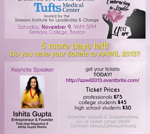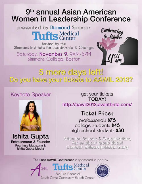 ASPIRE (Asian Sisters Participating in Reaching Excellence), Inc.TM, a Boston-based non-profit organization, will host its 6th Annual Asian American Women In Leadership (AAWIL) Conference at Boston University on Saturday, October 16, 2010. The conference celebrates and promotes leadership among Asian American girls and women. With the theme of “Discovering the Leader Within”, the 2010 AAWIL Conference aims to encourage attendees to explore, learn, and flourish. It will challenge and support Asian American women to take a leap. Speakers will share their experiences on how they were able to discover themselves through new inspirations and experiences which allowed for change in their lives.
